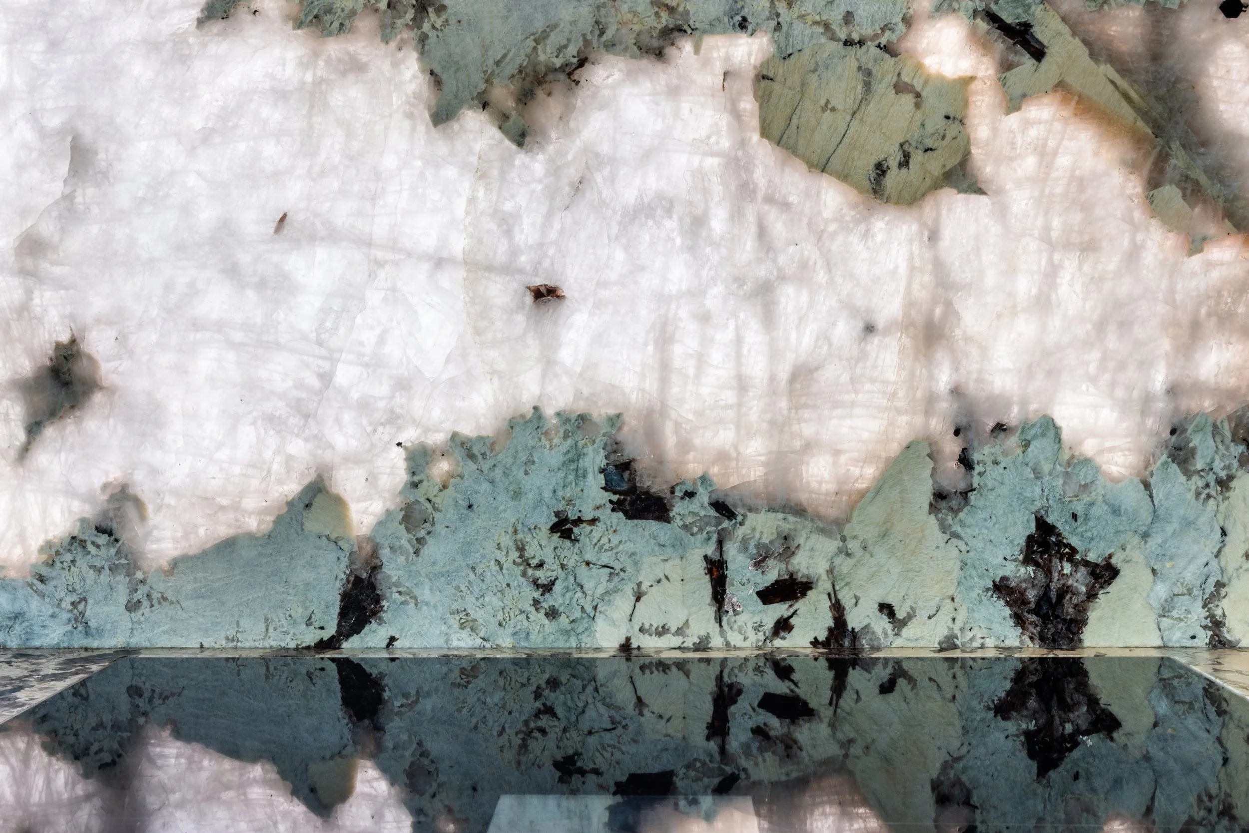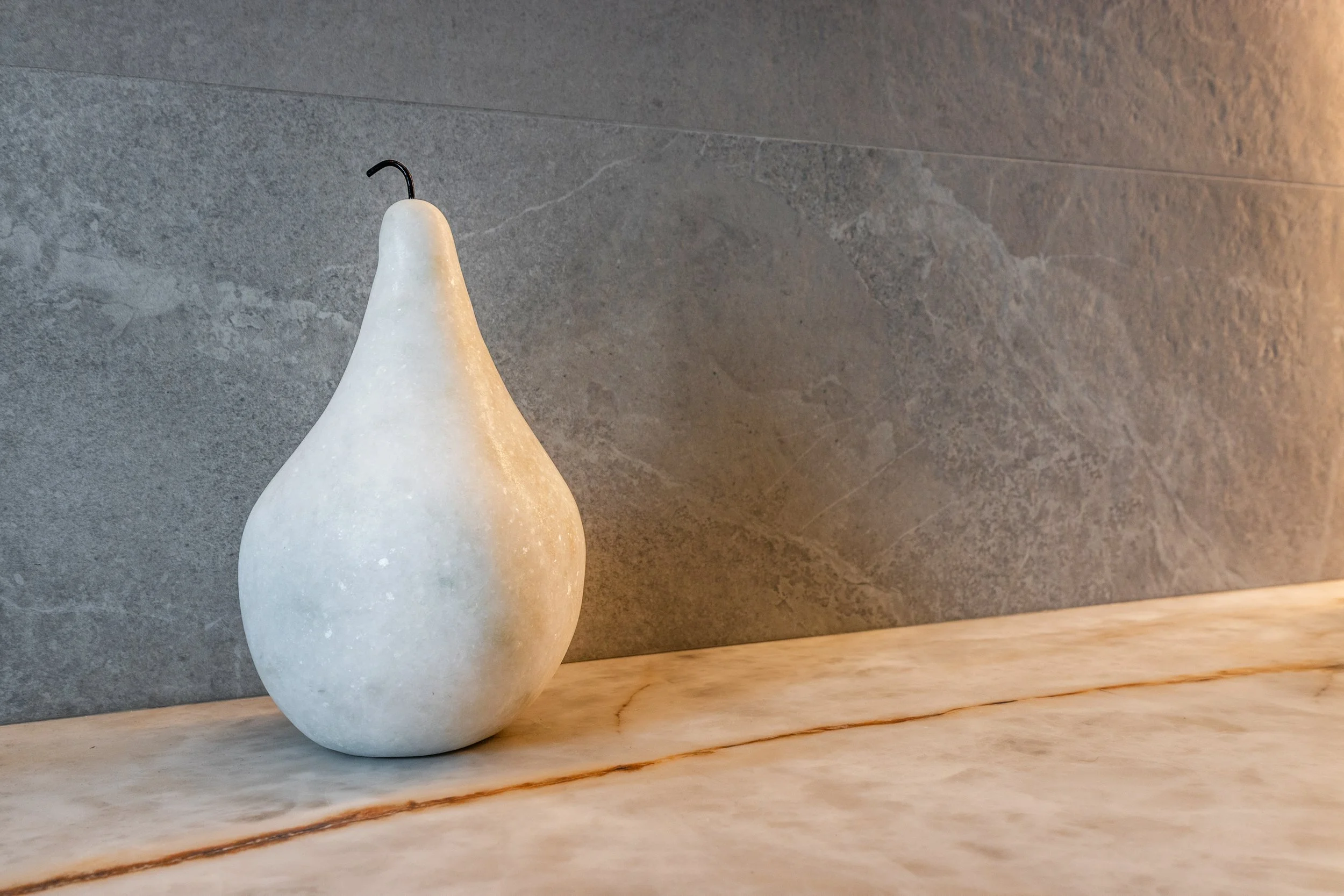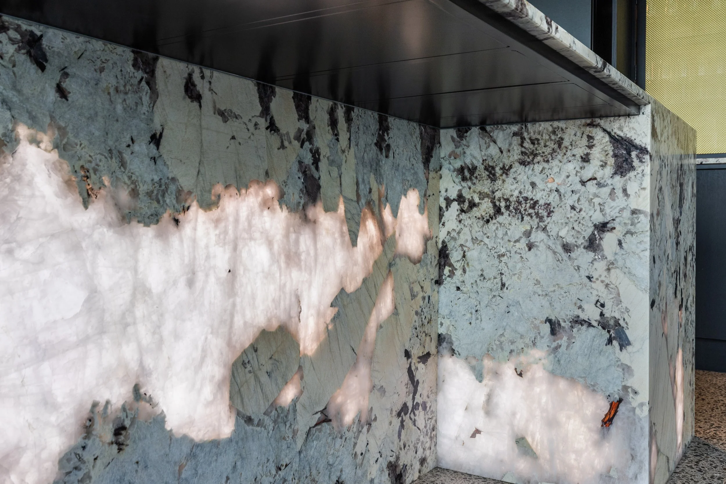 This striking kitchen centres around the dramatic beauty of backlit Patagonia Granite - a true showstopper and the defining feature of the space. LED light sheets were installed behind the granite on both the splash back and the island , requiring precise detailing to ensure even light diffusion and a flawless finish.