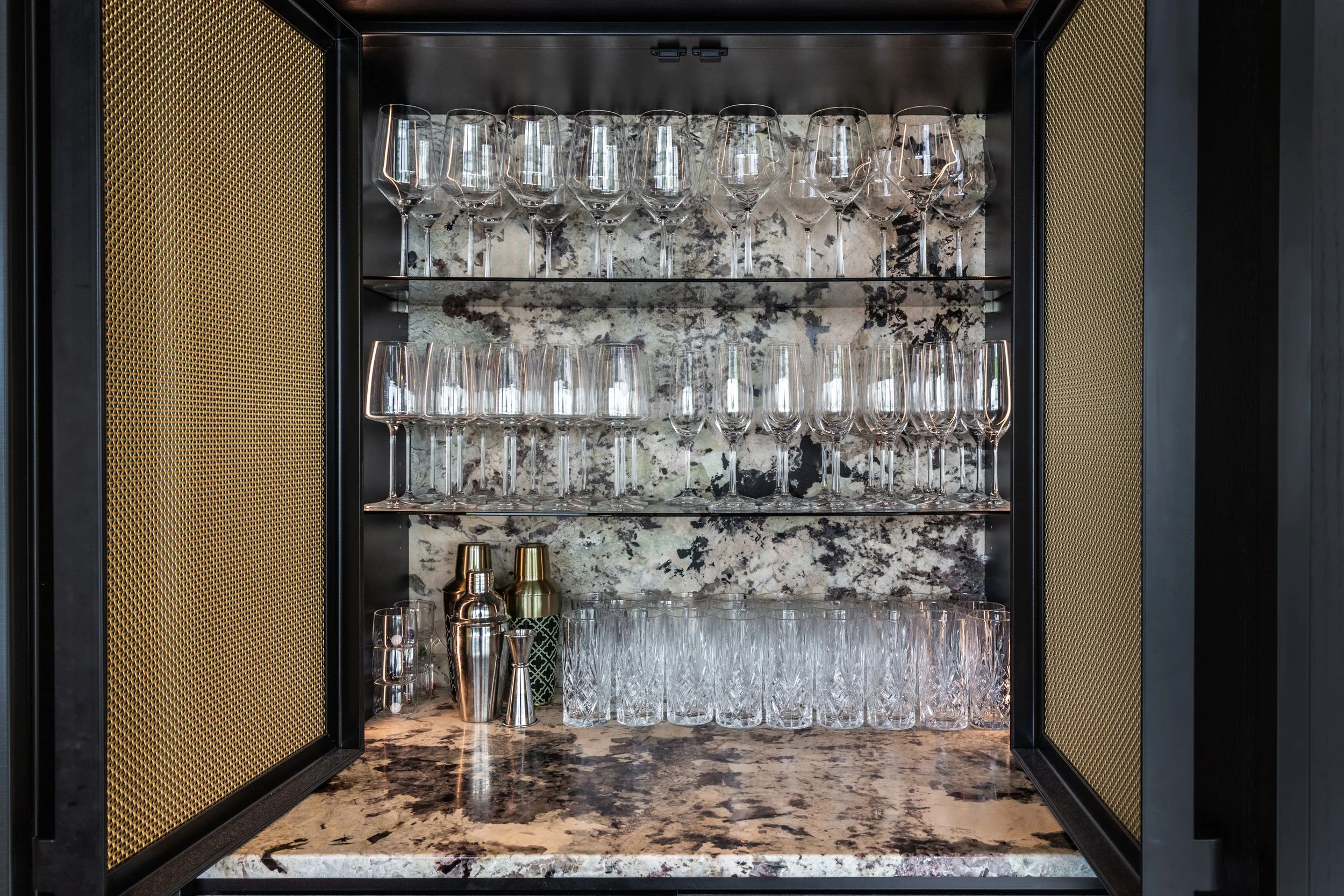 Cabinetry// VidaSpace Shinnoki Raven Oak Hardware// Blum Legabox Orion Grey with soft close runners Bench tops// CDK Stone backlit Patagonia Granite Pocket Door Hardware// Hafele Hawa Concepta Mesh Doors// Archant woven mesh