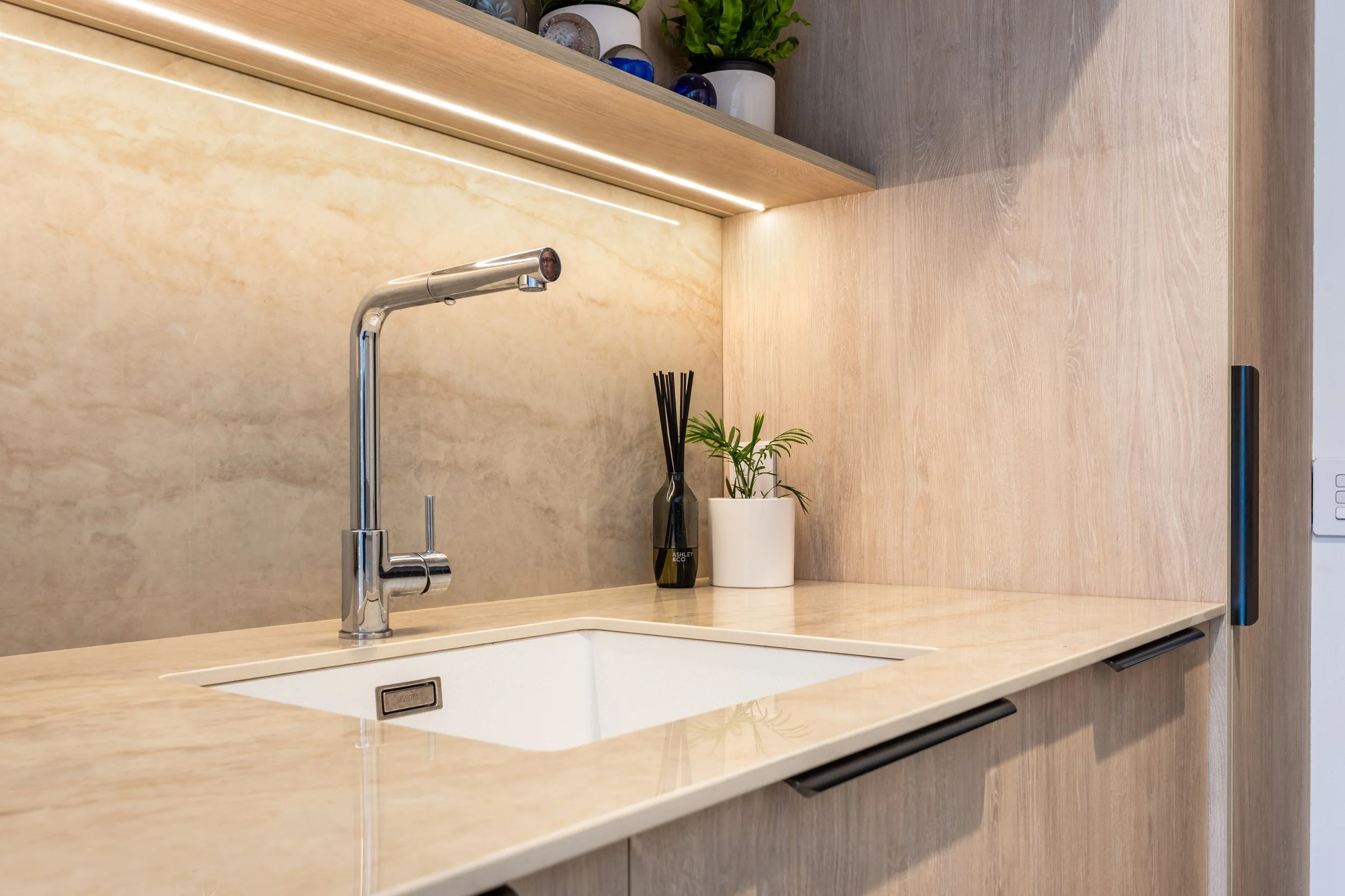 The island features waterfall ends on three sides and a 500mm cantilevered overhang for a breakfast bar. Given the stone’s weight and the integration of the LED lighting, we engineered a custom support solution to safely accommodate both the overhang and the LED panels, achieving strength without compromising the clean design.