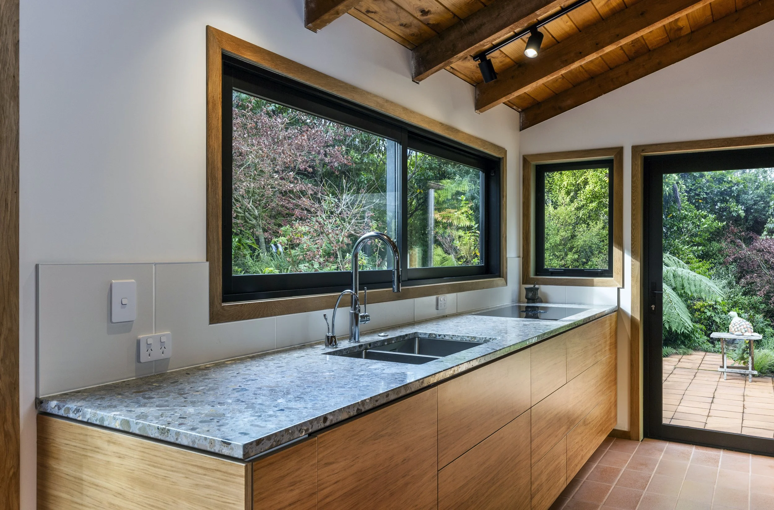 The rich, warm tones of the rimu veneer are beautifully complemented by terracotta tiles and matching rimu architraves. The terrazzo bench tops add a touch of texture and luxury, completing a space that is both functional and visually stunning. This kitchen is a perfect example of how natural materials and thoughtful design can come together to create a space that is as enduring as it is beautiful.